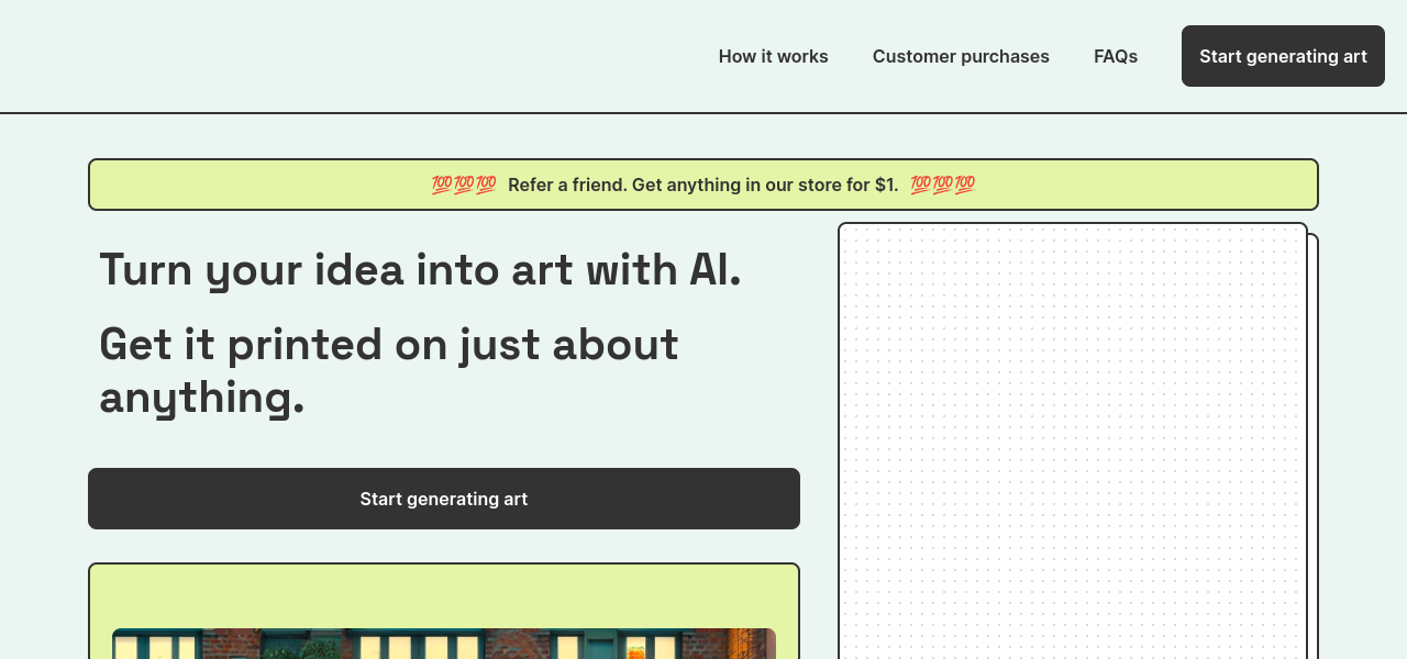 AI-powered tool that transforms ideas into unique, AI-generated art for a variety of products.