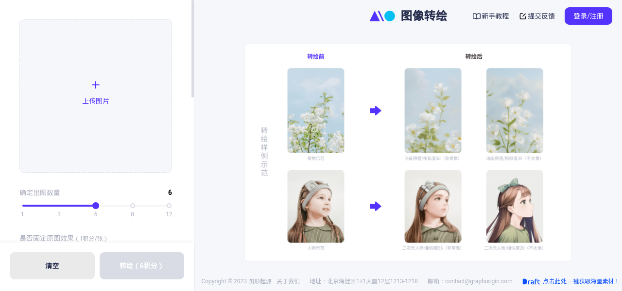 AI-powered image-to-illustration tool with customizable styles, dimensions, and outlines. Offers Disney, oil painting, comic book styles.