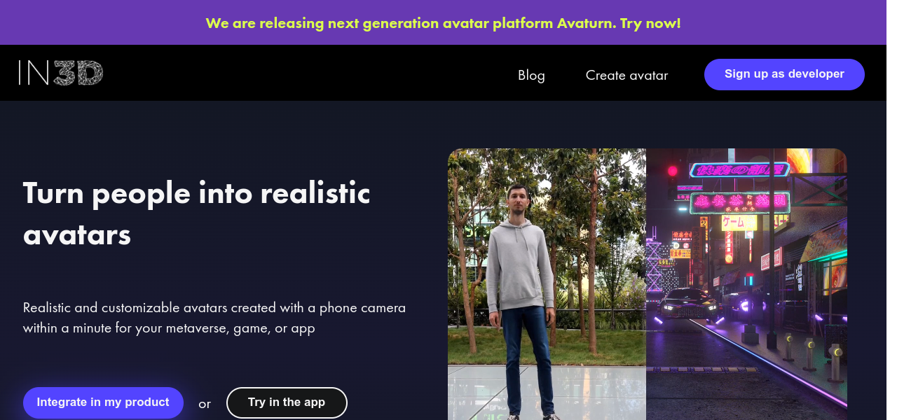 In3D: Transform people into customizable avatars using a phone camera for metaverse, games, or apps.