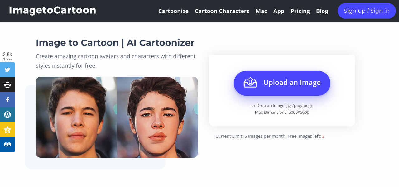 AI-powered online cartoonizer: quickly transforms images into cartoon or anime styles with over 50 effects to choose from.