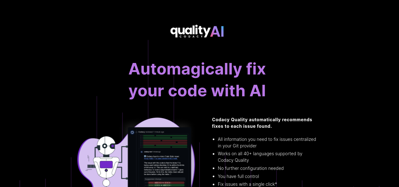 AI tool for automatic code issue fixes in 40+ languages. Streamlines workflow & improves coding practices.