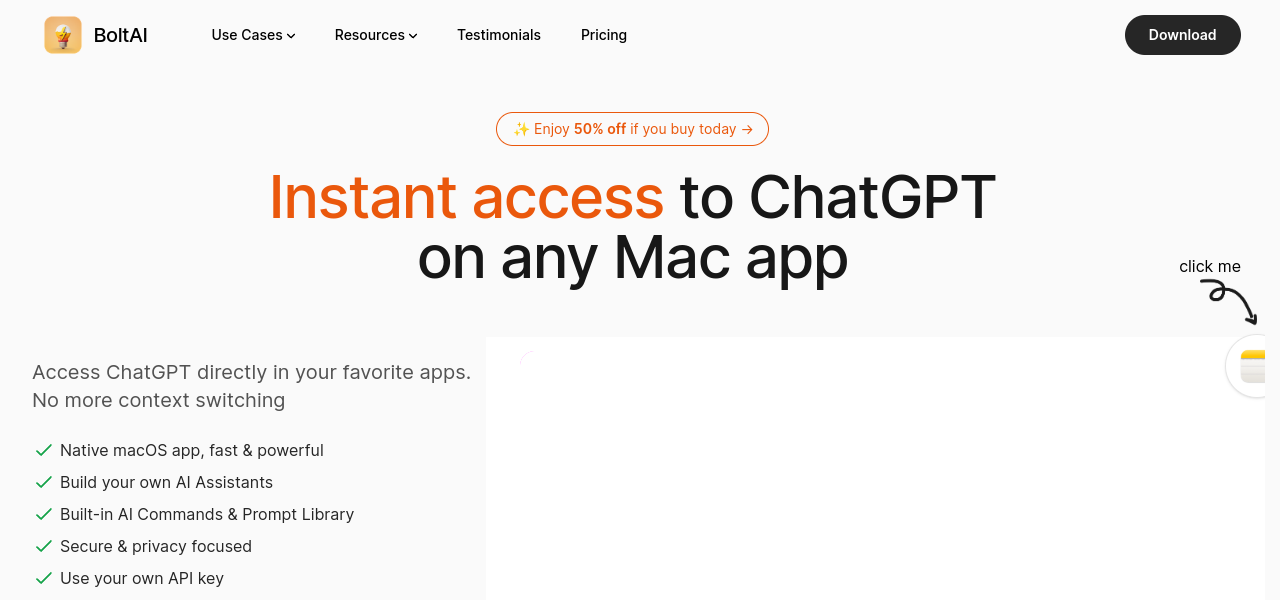 BoltAI: Access ChatGPT instantly in any Mac app, personalize responses, automate tasks, and enhance workflow.