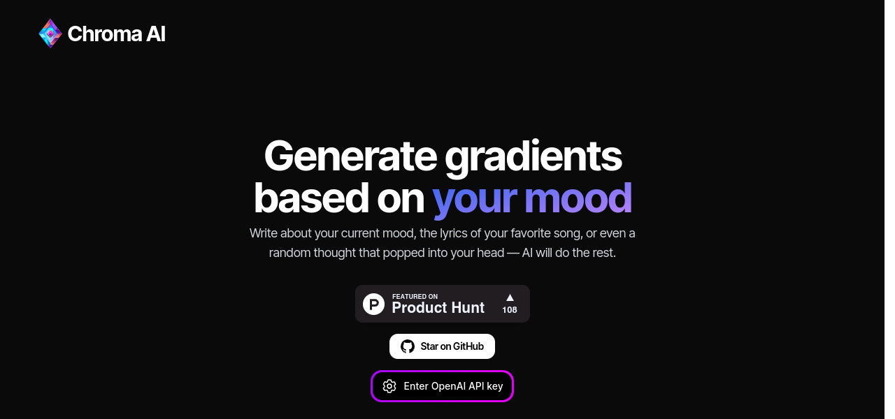 Generate stunning color gradients effortlessly based on mood, lyrics, or random thoughts.