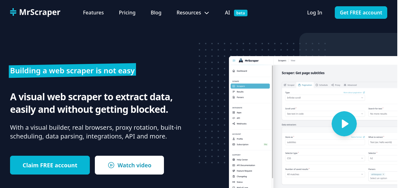 AI-powered web scraper for data extraction without code selectors, handling complex pages, pagination, proxy rotation, and scheduling.