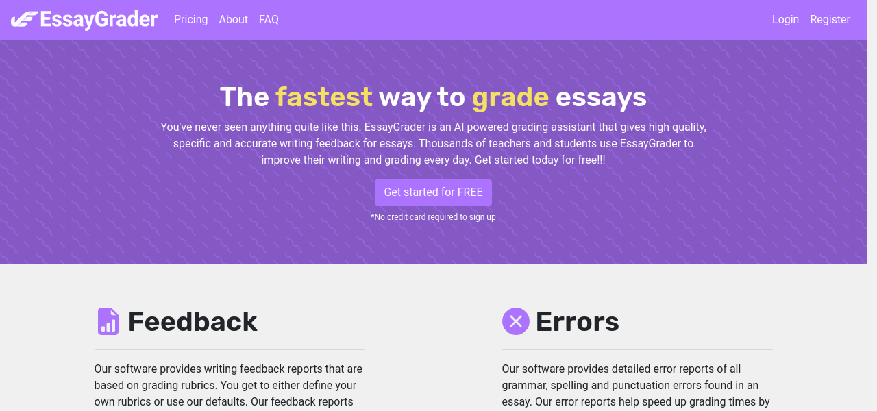 Efficiently grade essays with detailed feedback, error reports, summarization, and forthcoming AI Detector feature.