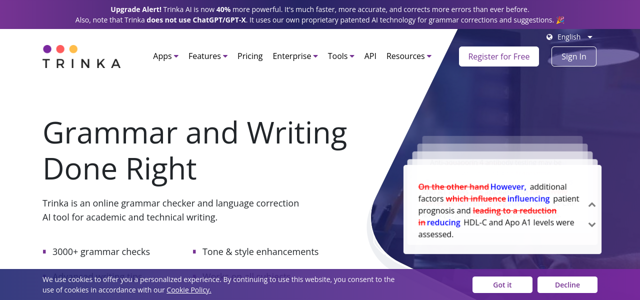 Trinka.ai is an AI tool that enhances academic and technical writing with grammar corrections and writing suggestions.