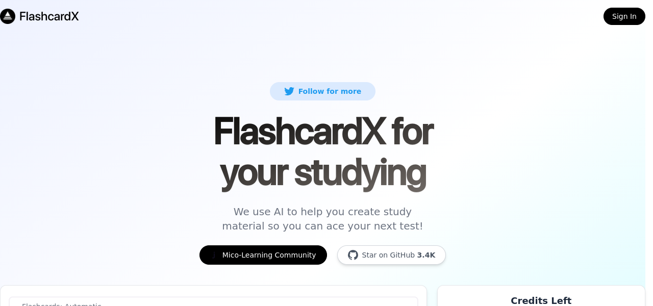FlashcardX: AI-powered flashcard creation for customizable decks to enhance studying, preparation, and language learning.