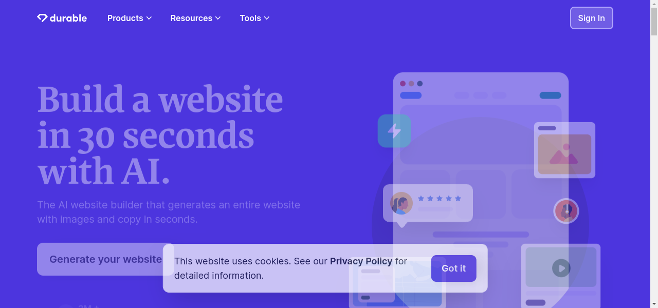 AI-powered website builder that creates professional websites in just 30 seconds, with customization options and all-in-one platform.
