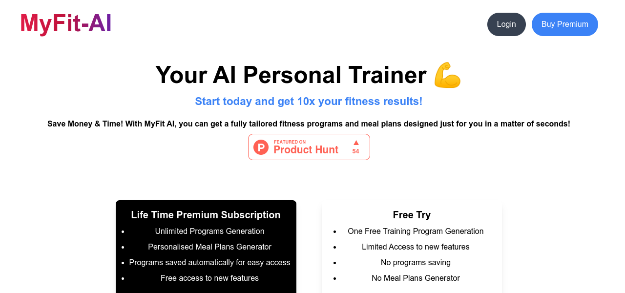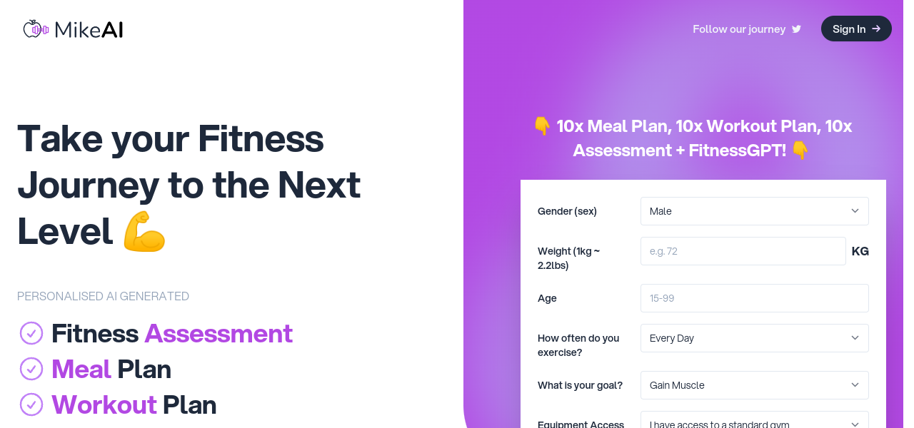 AI fitness coach that offers personalized nutrition and workout plans, progress tracking, and a chatbot.