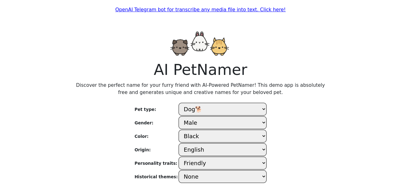 AI Pet Name Generator: AI-powered tool for generating unique and creative pet names based on user inputs.