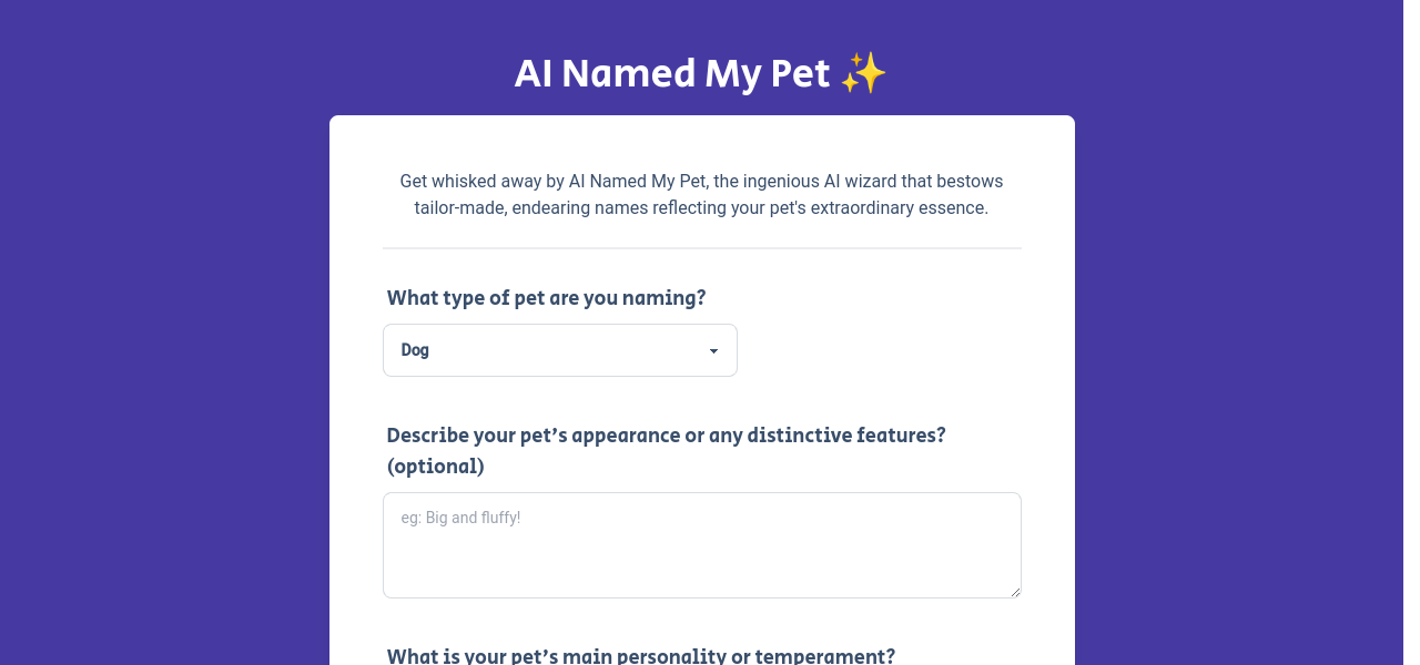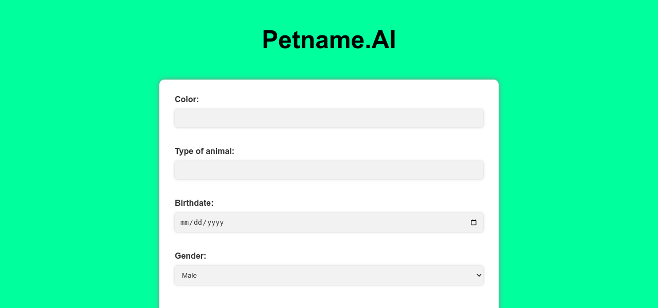AI tool that generates 20 pet names based on color, animal type, birthdate, and gender.