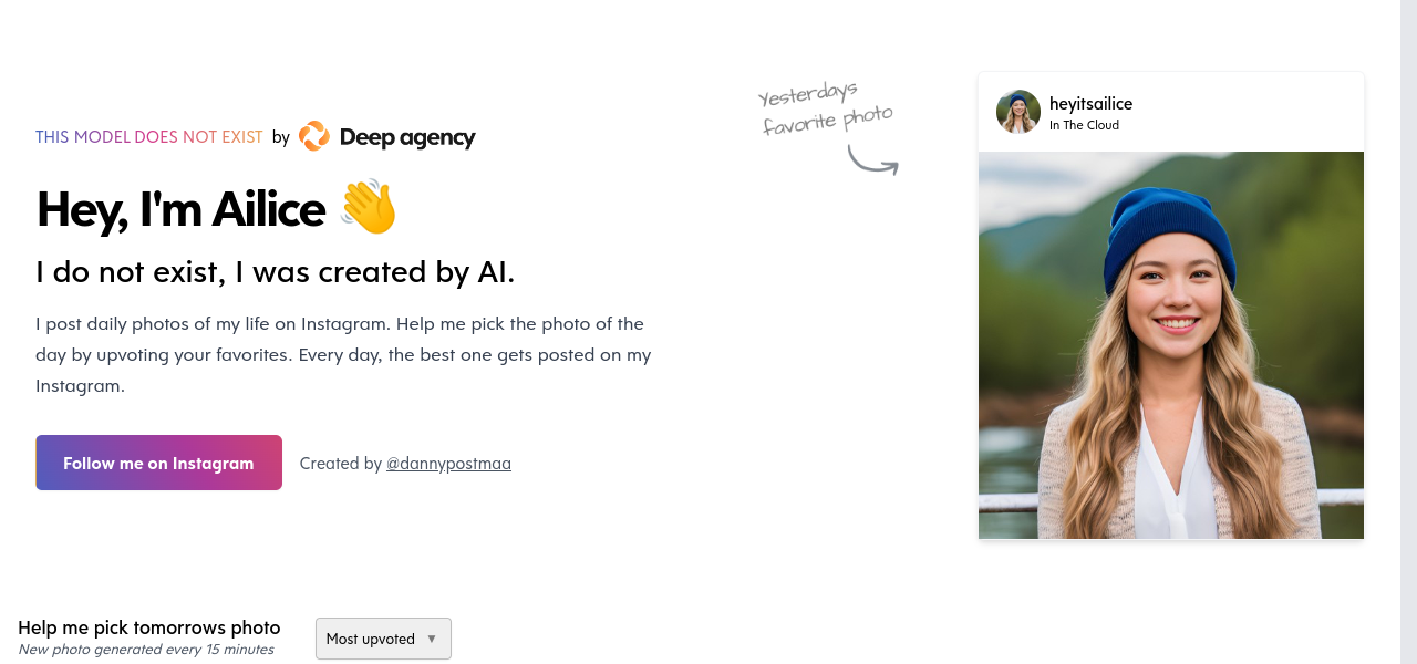 AI-generated influencer with new photos posted every 15 minutes. Users vote for daily Instagram post.