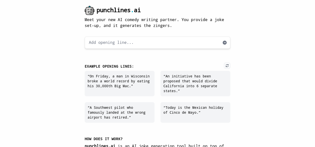 AI-powered joke generator for generating quick and witty punchlines, accessible for comedians, writers, and developers.
