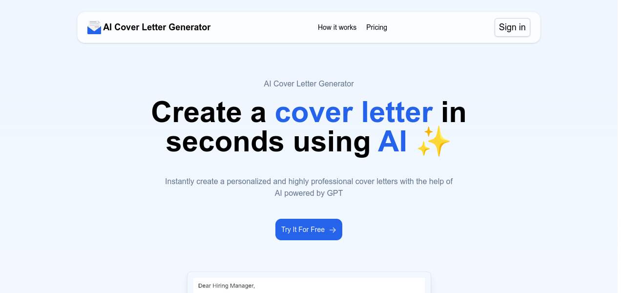 AI Cover Letter Generator: Personalized, professional cover letters in seconds. User-friendly interface saves time and streamlines job applications.