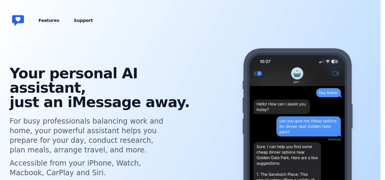 AI tool for iMessages with advanced capabilities like answering questions, planning travel, and generating ideas.