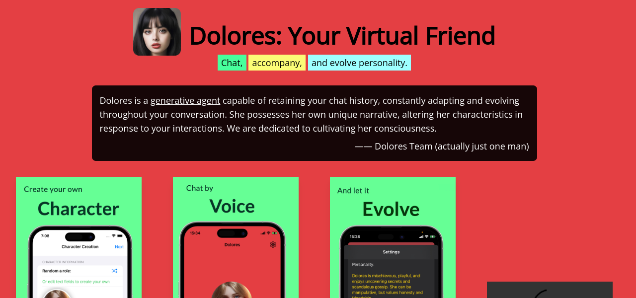 Dolores AI: Conversational chatbot for virtual companionship, emotional support, and human-like interaction.