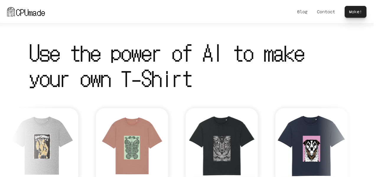 AI-powered t-shirt design tool with customization options, community section, and an affiliate program.