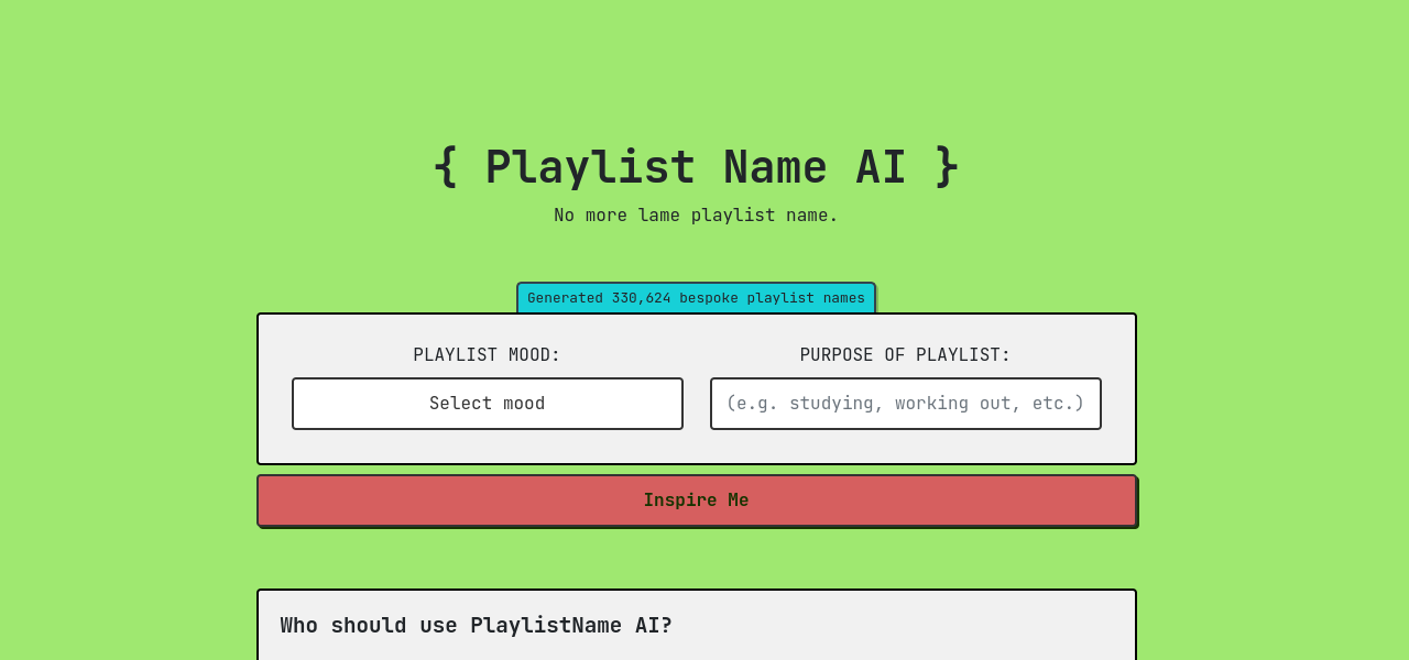 AI-powered playlist name generation with a variety of moods, purpose specification, and name variation request.