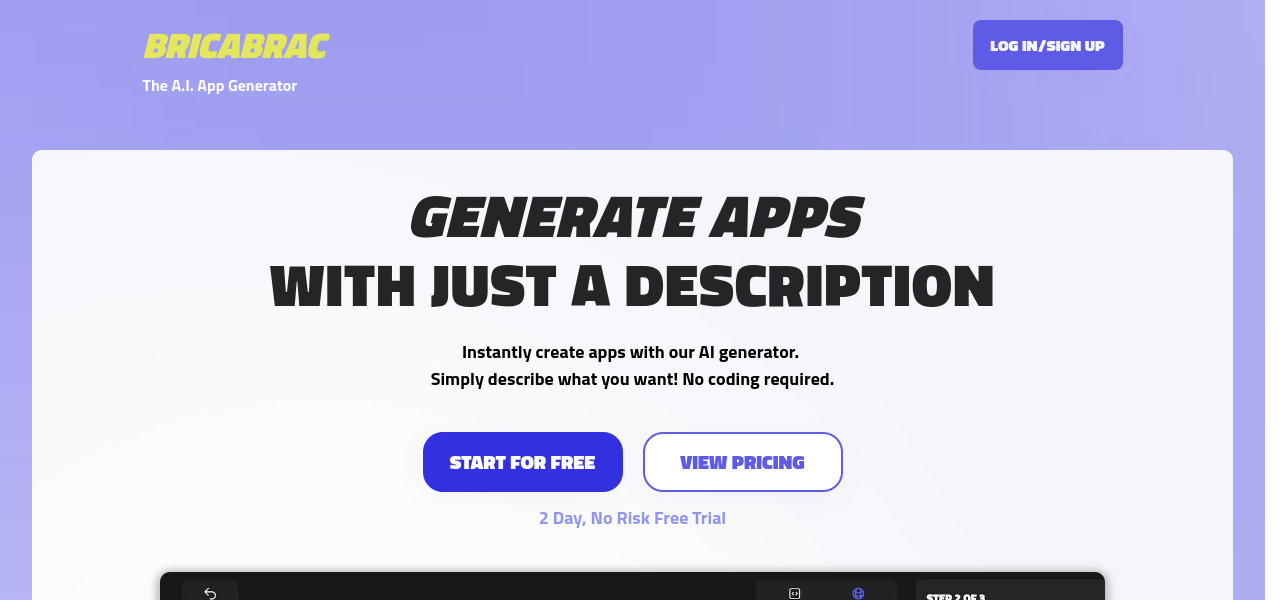 AI-powered app generation from text descriptions with a clean UI and flexible plans, no coding required.