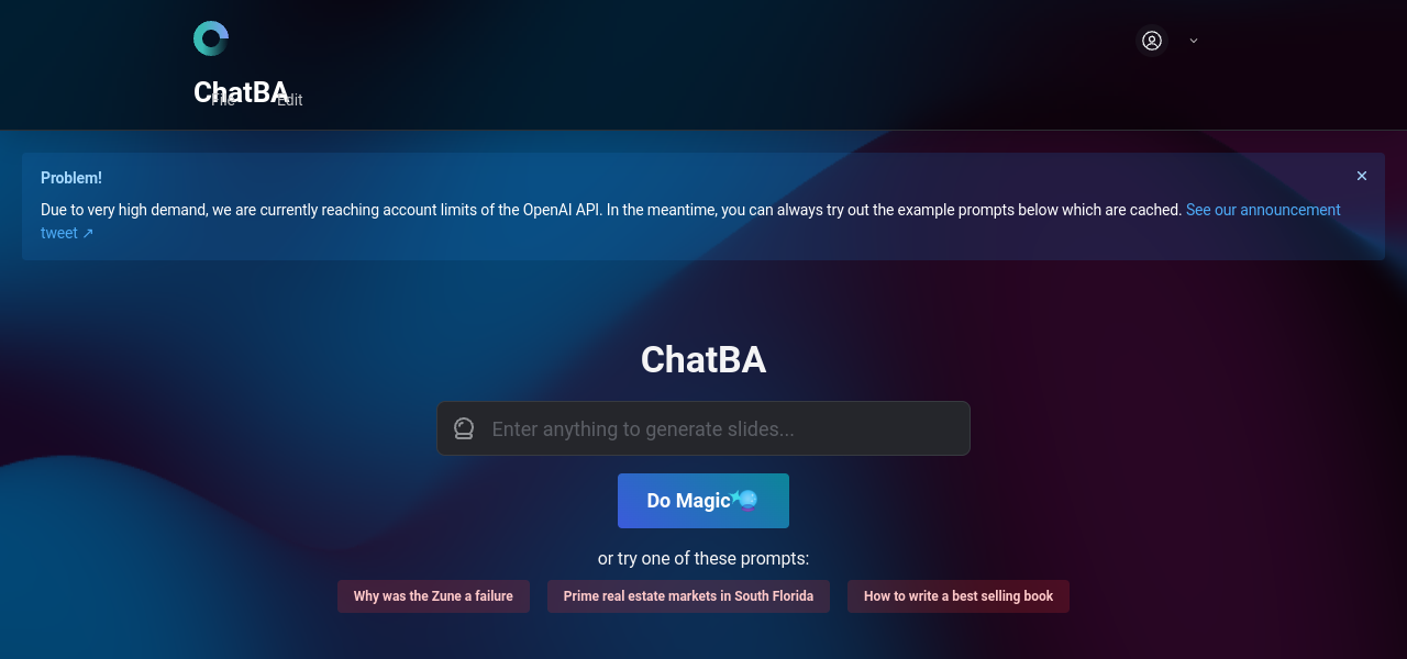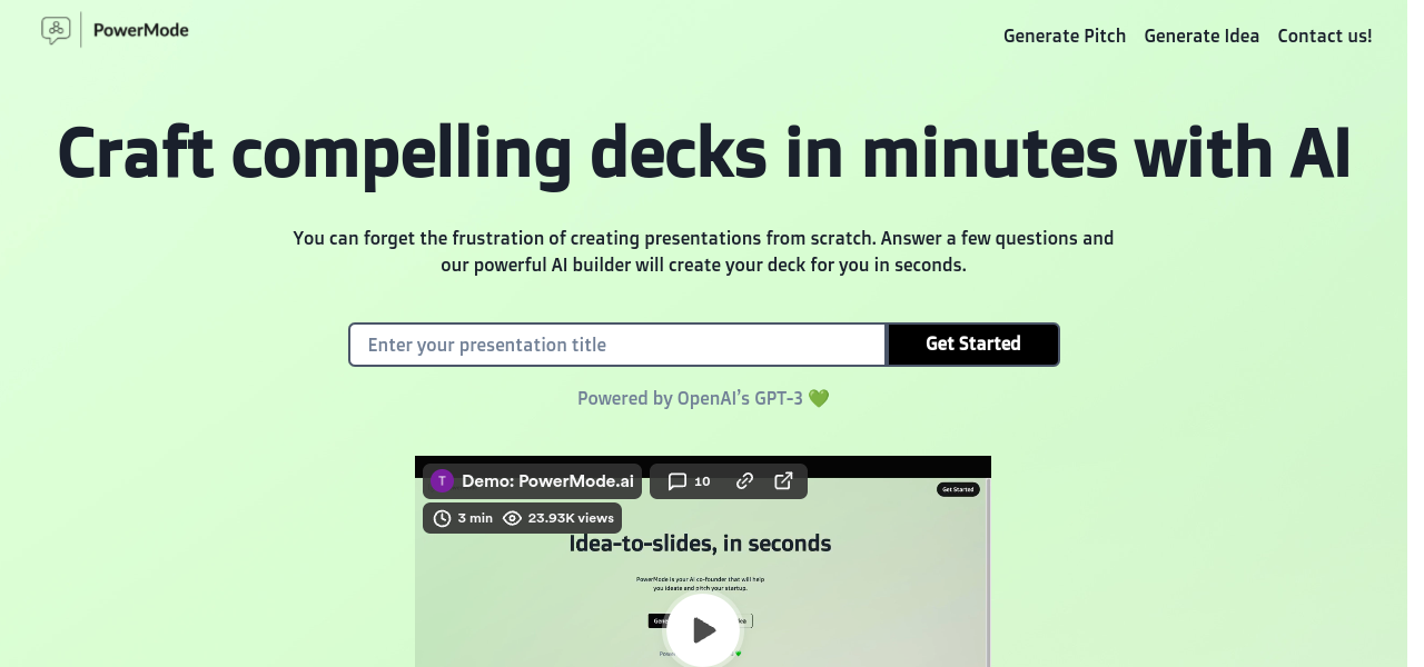 AI tool that effortlessly generates startup ideas and pitch decks using GPT-3 technology.