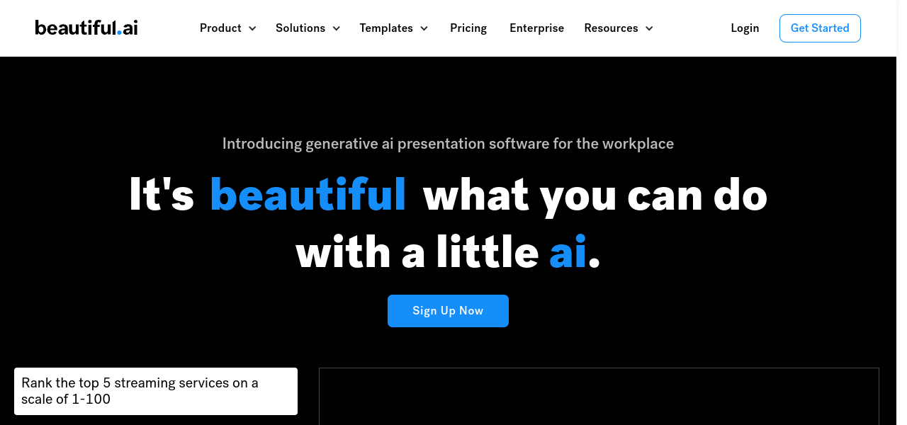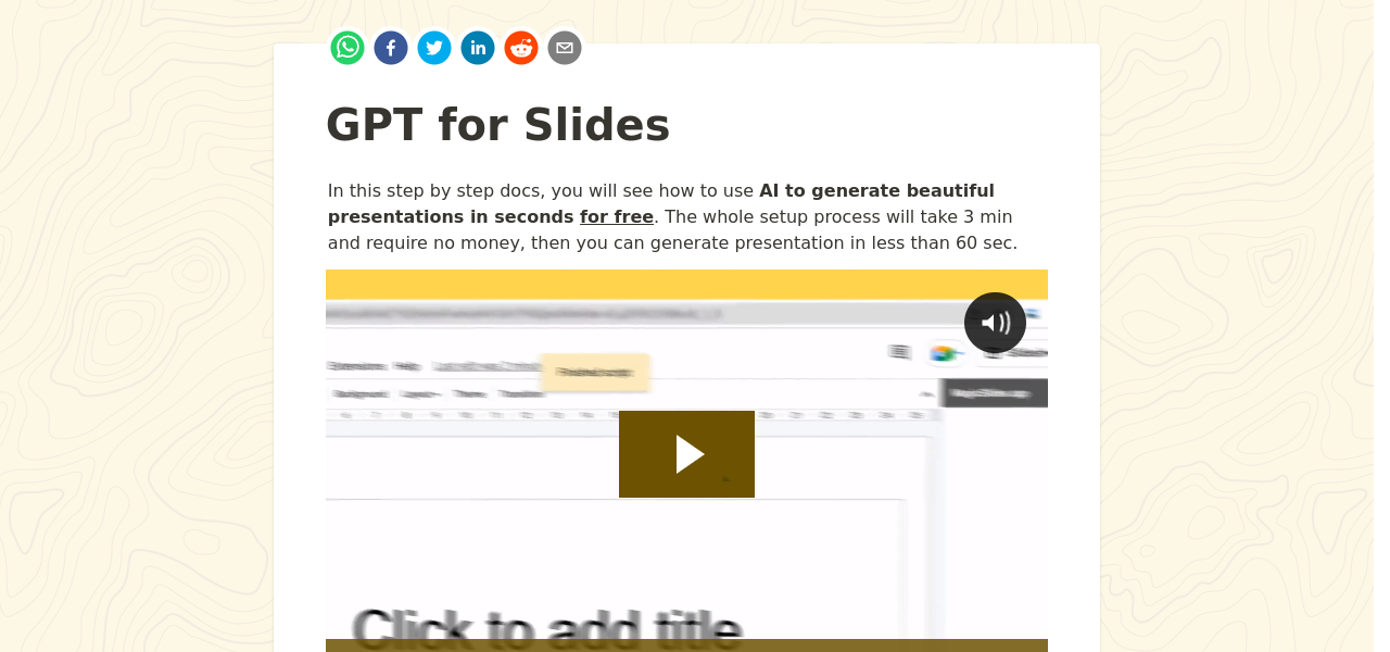 AI-powered platform generates slides and videos; create professional-quality content, export, share, and user-friendly interface.