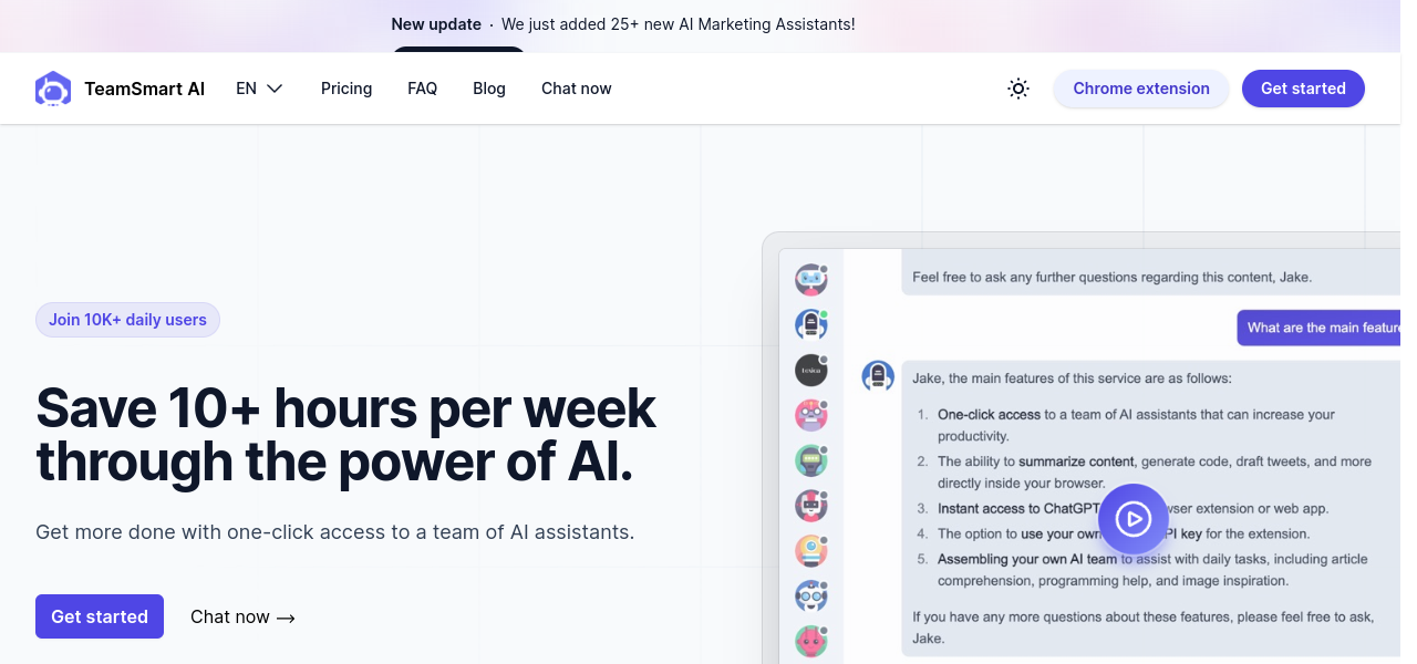Boost productivity with TeamSmart AI, a Chrome extension providing seamless access to AI assistants.