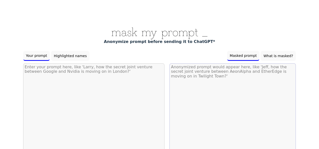 Anonymize prompts by automatically replacing names, organizations, and locations with fictional counterparts.