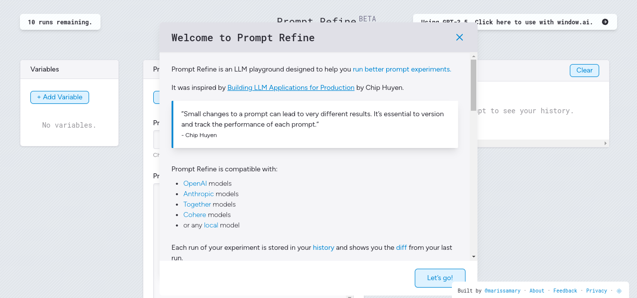 LLM playground for prompt experimentation, compatibility with various models, history tracking, folder organization, and CSV export.