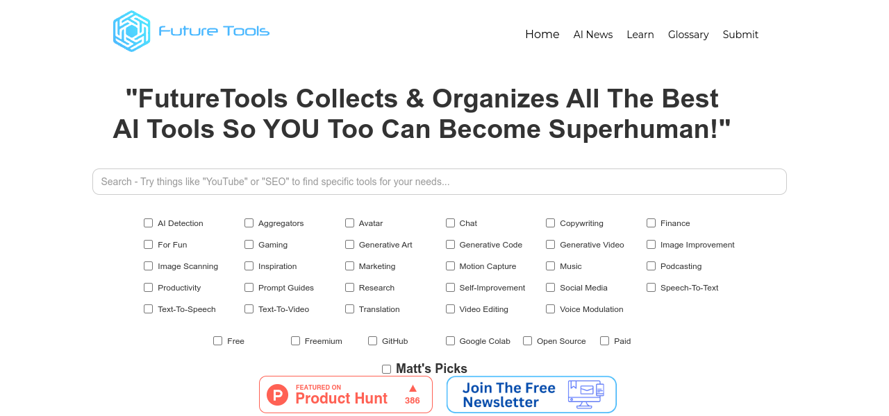 Future Tools Features: AI tool platform with wide range of applications and pricing options. Users can submit new tools.
