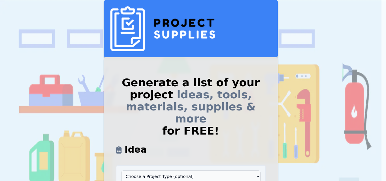AI-powered tool for DIY project planning. Get personalized supply recommendations for various projects, for free.