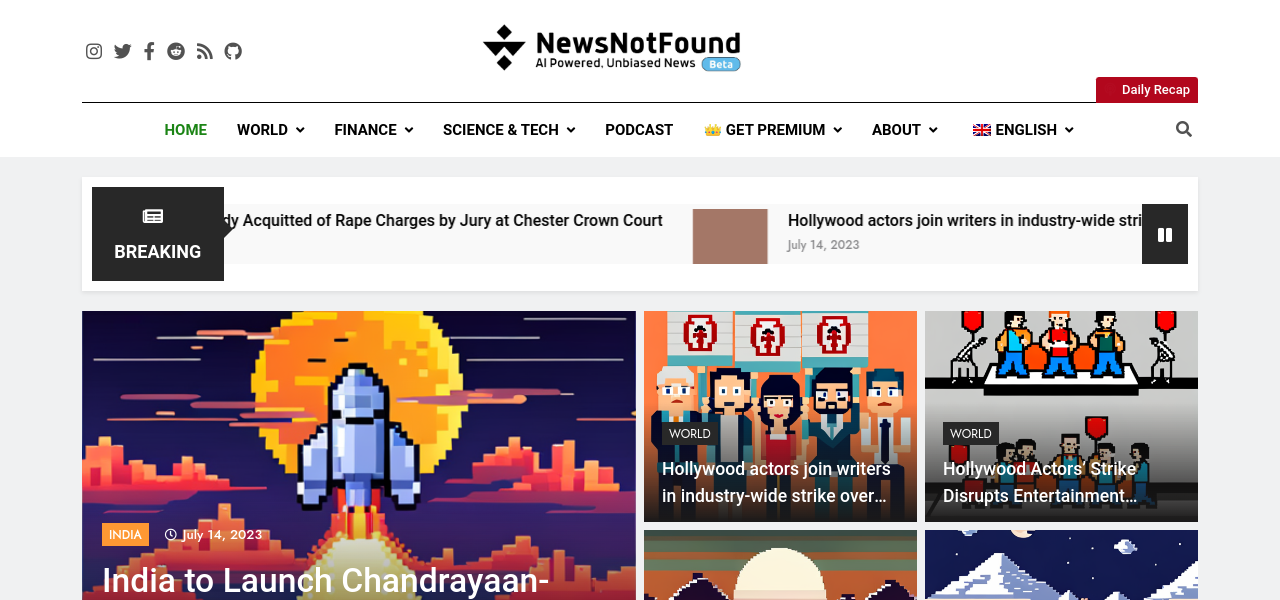 Unbiased news website with categories, multiple languages, breaking news, social media presence, GitHub repository, and changelog page.