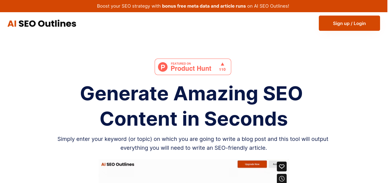 AI SEO Outlines: Generate SEO-optimized content outlines with comprehensive article structure, LSI keywords, FAQs, and image suggestions.