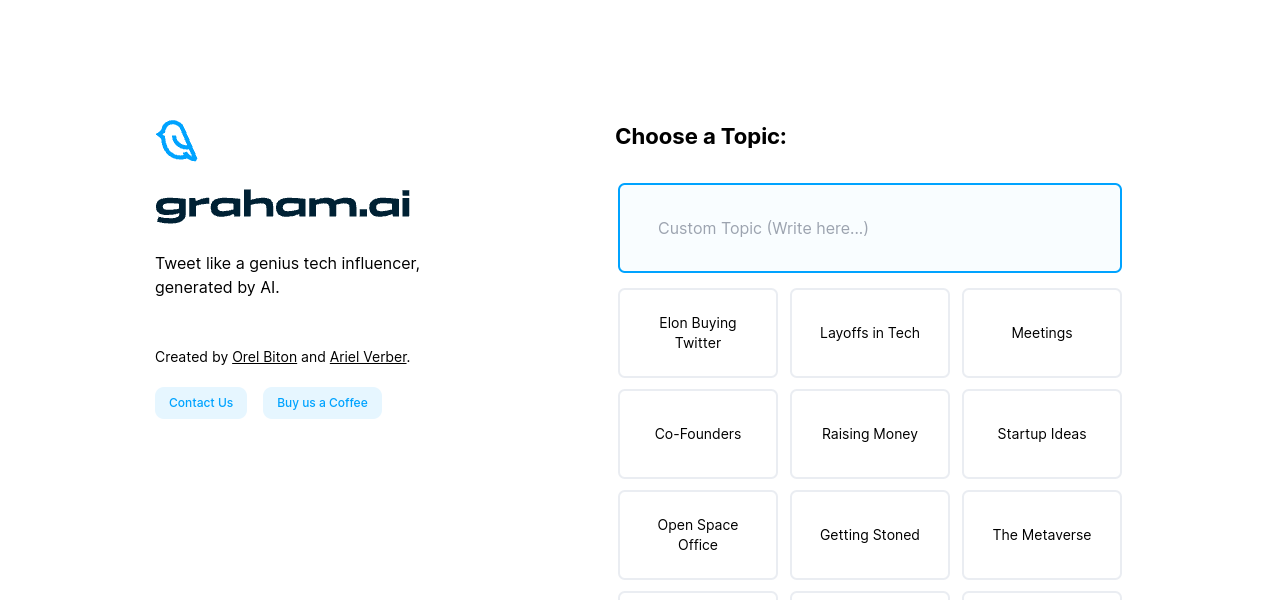 Graham AI: AI-generated tweets for tech influencers, covering wide range of subjects. Authentic and engaging content.