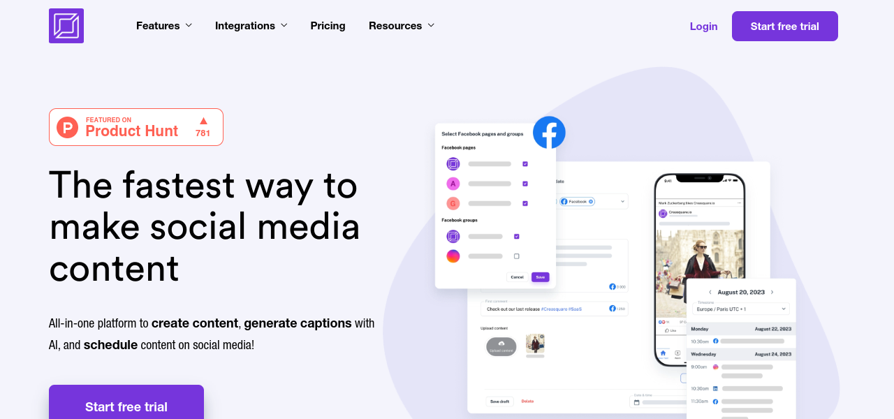AI-powered social media management tool with content generation, scheduling, integrations, and extensive creative assets.