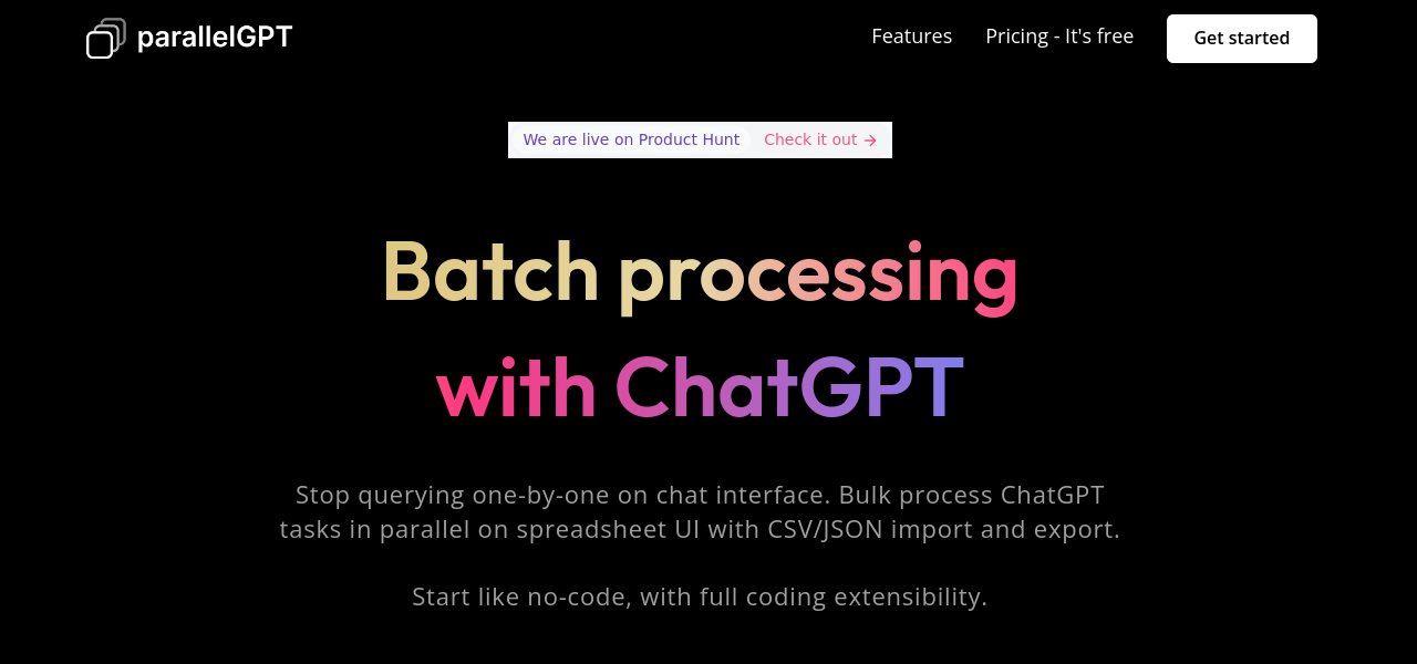 ParallelGPT for ChatGPT AI: Batch process queries, import prompts, collaborate, and ensure data security and privacy.