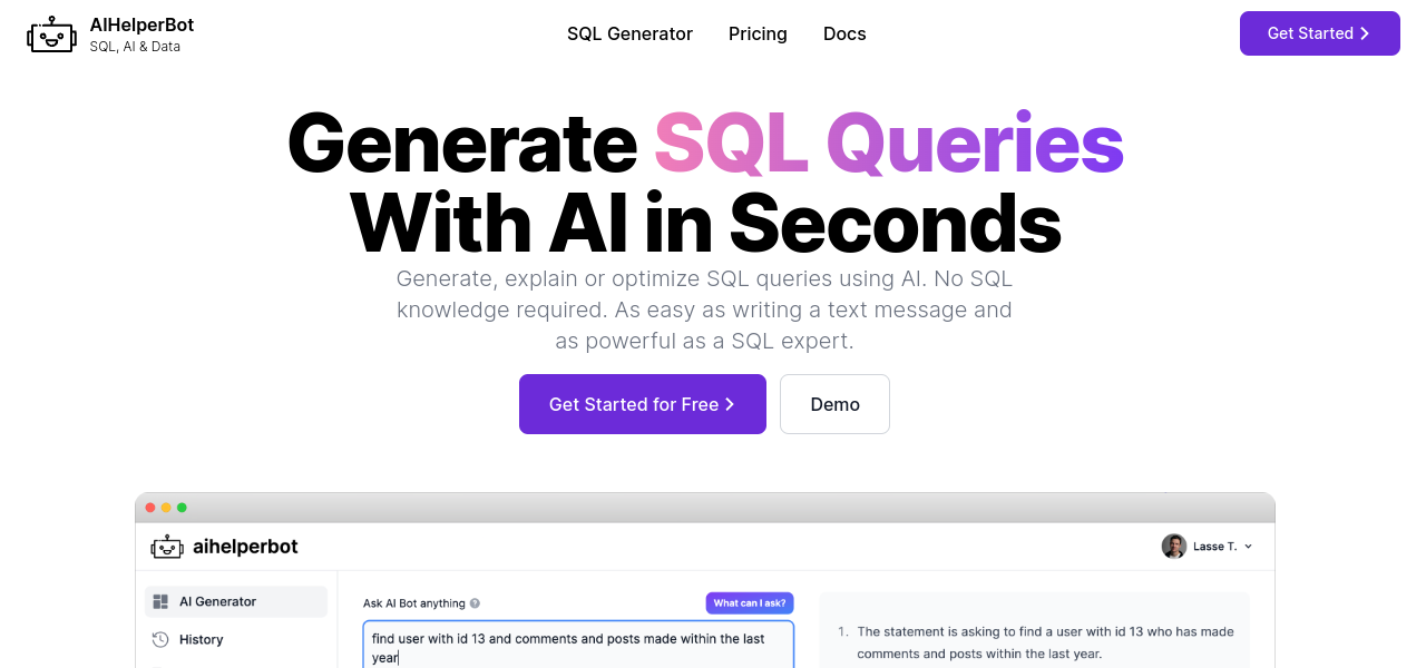 AI-powered SQL generator that simplifies writing complex queries and supports multiple database languages.