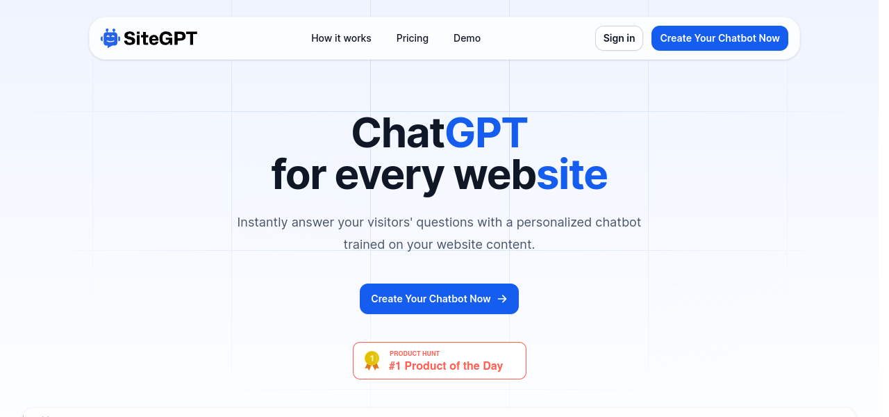 SiteGPT – AI chatbot for websites. Instantly answer questions, no coding needed. Improve customer support and user experience.