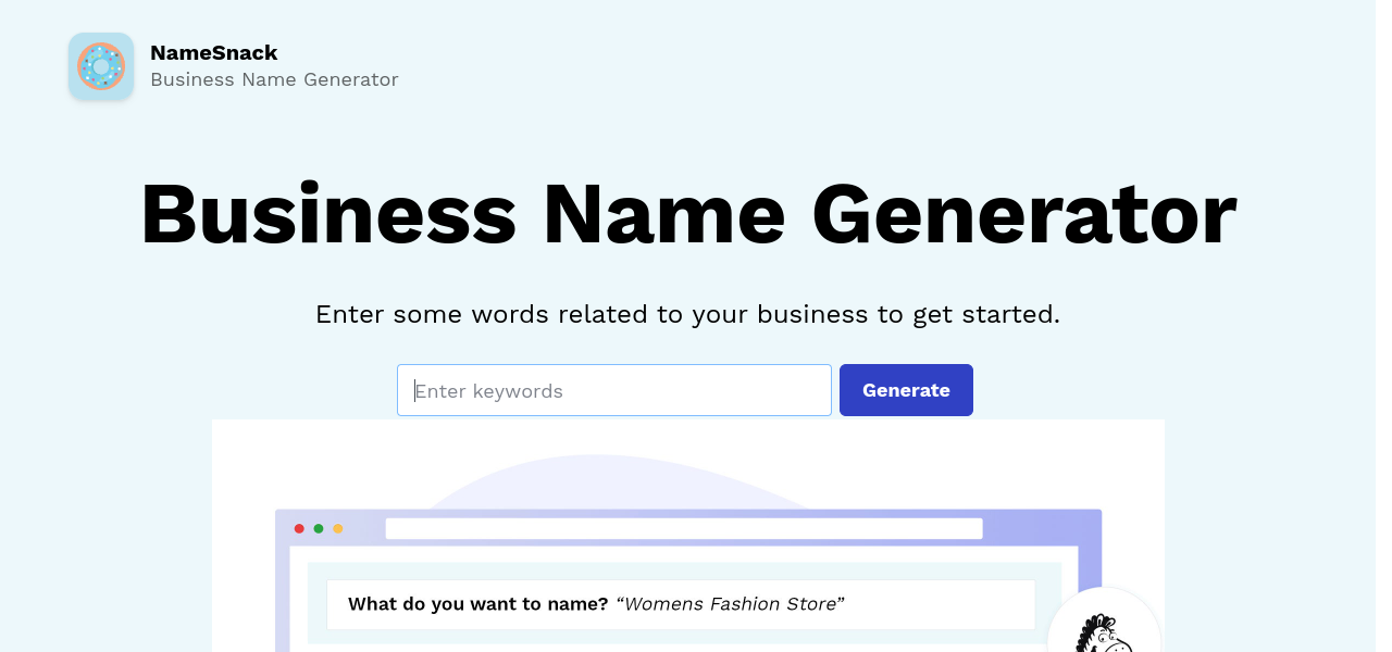 AI-powered name generator creating unique, brandable names for businesses. Includes domain name search and logo design.