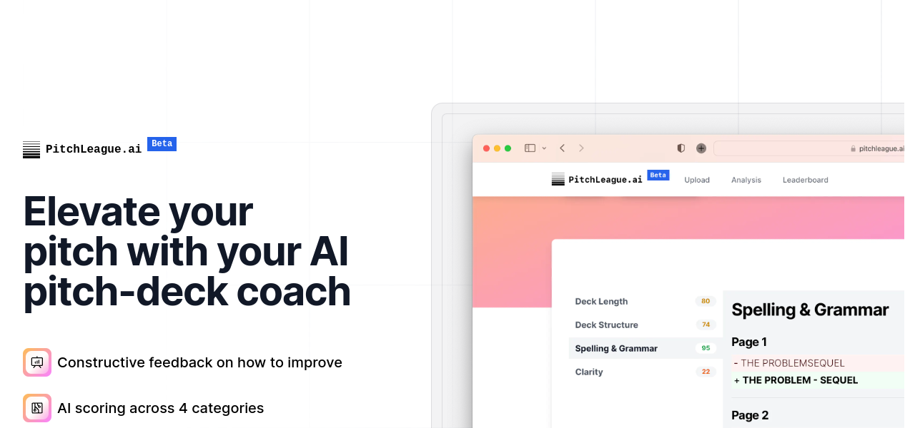 AI-powered platform for startup founders to improve pitch decks and gain valuable insights for investor presentation.