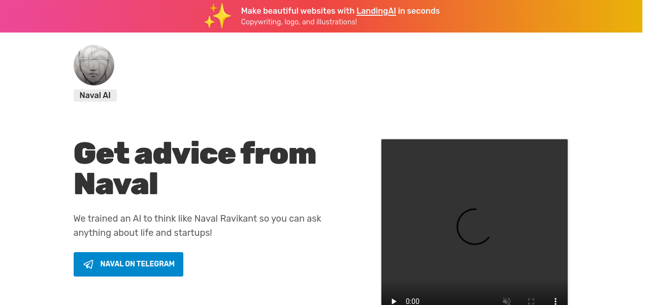 AI tool emulating Naval Ravikant’s thinking style, providing practical advice on life and startups.