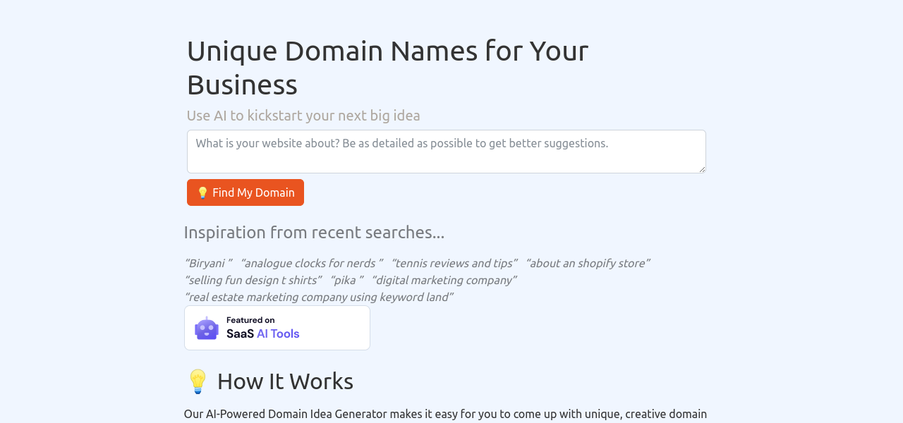 AI tool generates unique, memorable domain names based on user input for websites and businesses.