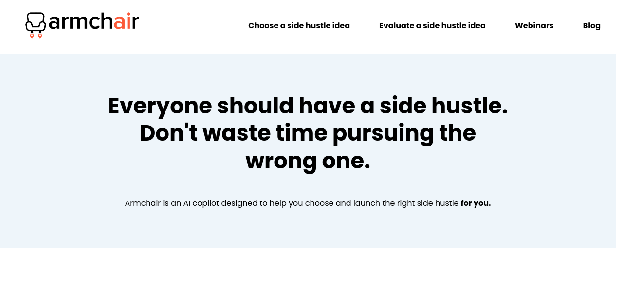 Armchair: AI tool recommends personalized business ideas and side hustles based on goals, skills, experience, and interests.