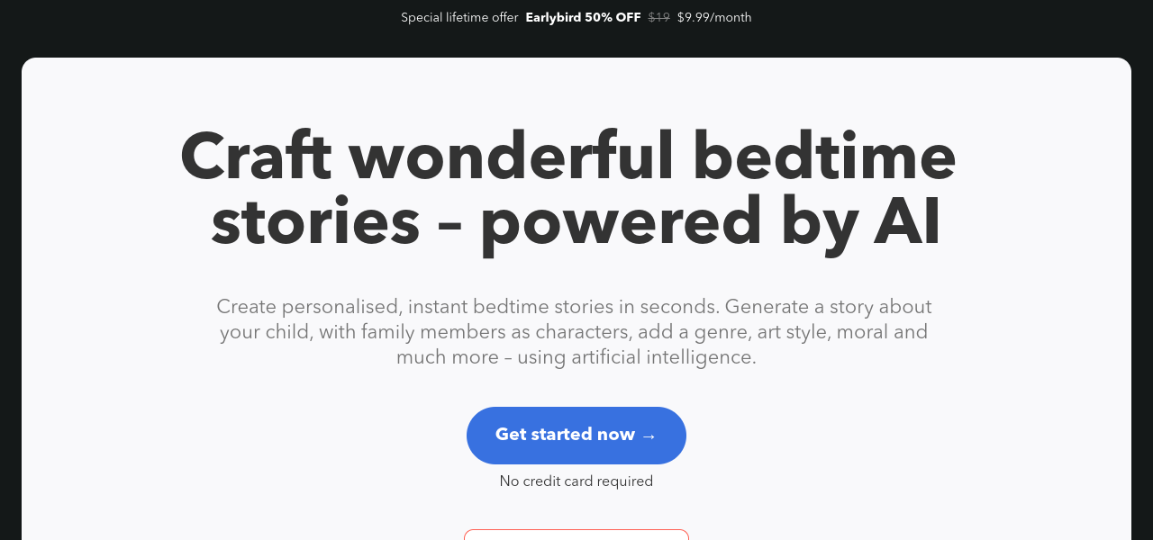 AI-powered bedtime story creator with personalized, customizable stories. Access community-created stories, and 50% off discount available.