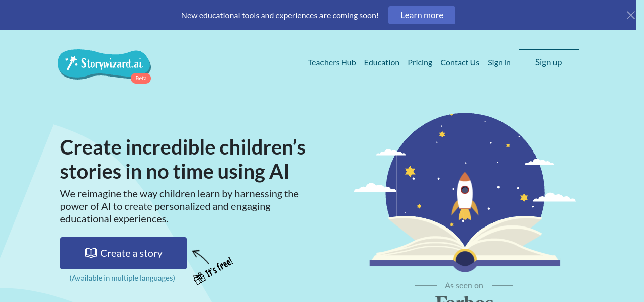 Customize, create, and share personalized children’s stories with illustrations, educational elements, and multilingual support.