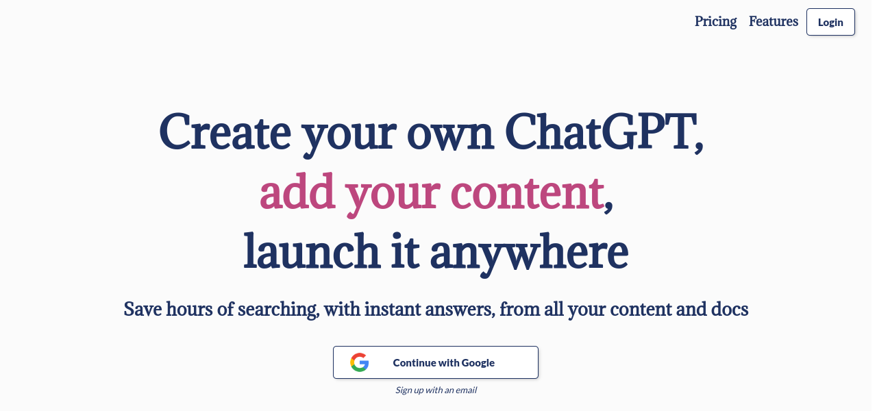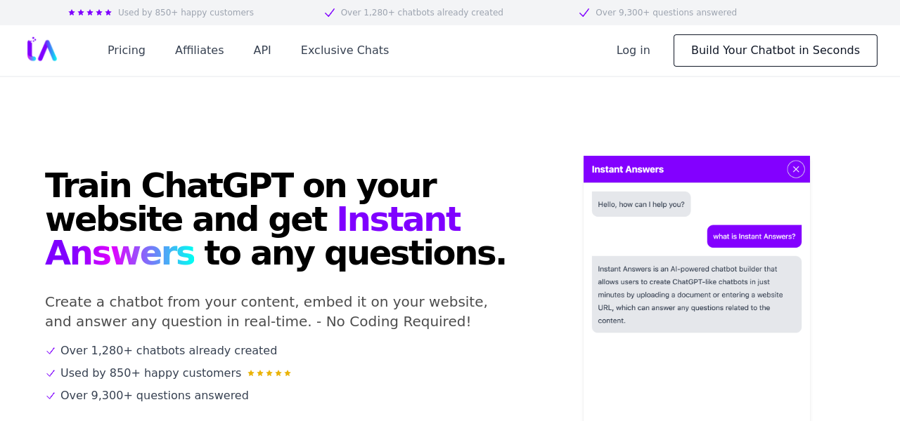 Custom chatbots, intuitive interface, embeddable widgets, instant answers, file support, flexible training, range of plans.