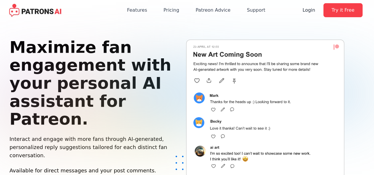 AI-powered assistant for Patreon creators: personalized reply suggestions, saves time, enhances fan engagement.