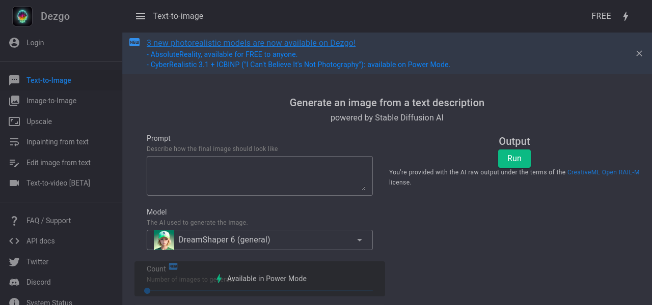 Dezgo’s AI tool generates high-quality images from text prompts, with adjustable interpretations and aspect ratio control.