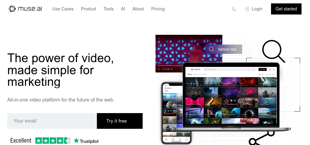 AI-powered video platform with features like video player, hosting, search, transcriptions, customization, monetization, and more.
