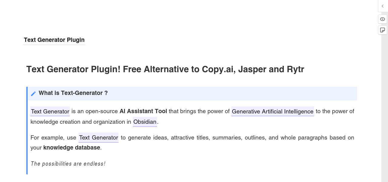 Open-source AI Assistant Tool for generating ideas, titles, summaries, outlines, and paragraphs in Obsidian.