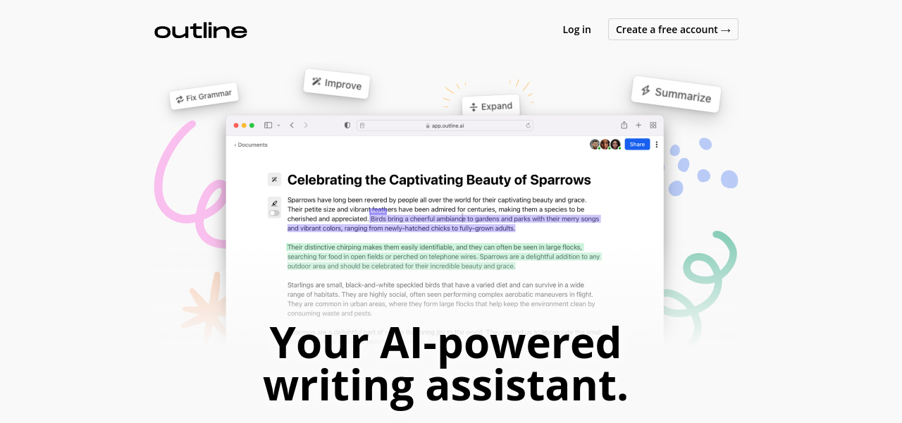 AI-powered collaborative document editor with writing assistance, thesaurus, chatbot assistant, and simplified editing process.